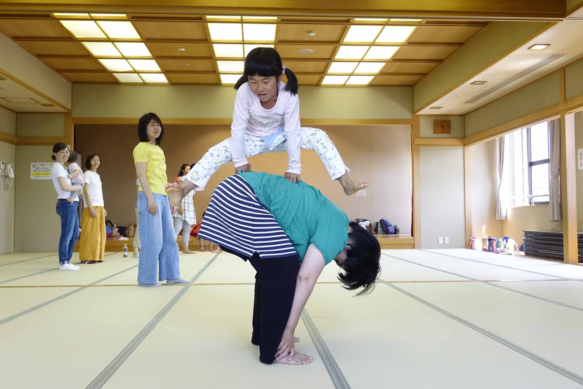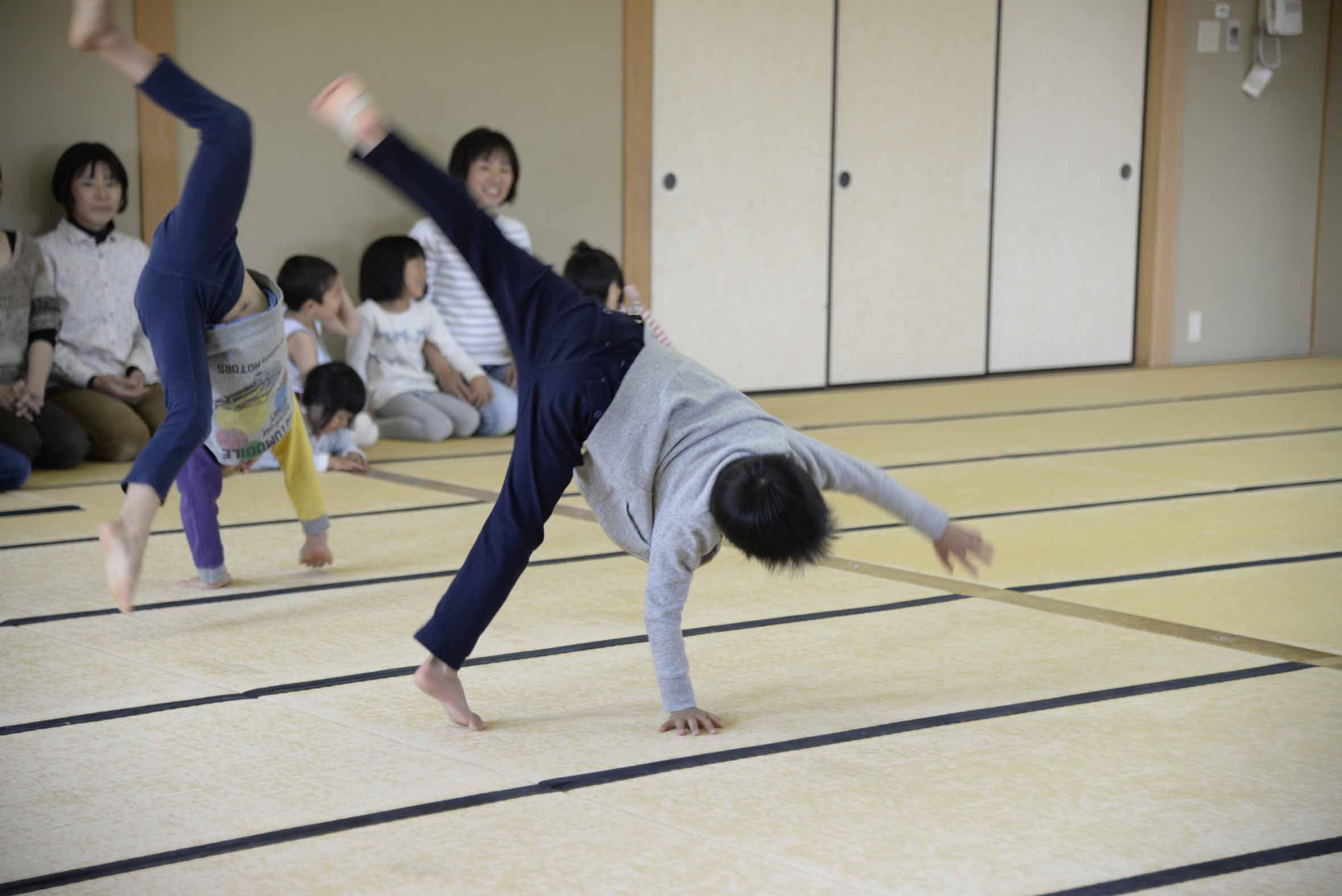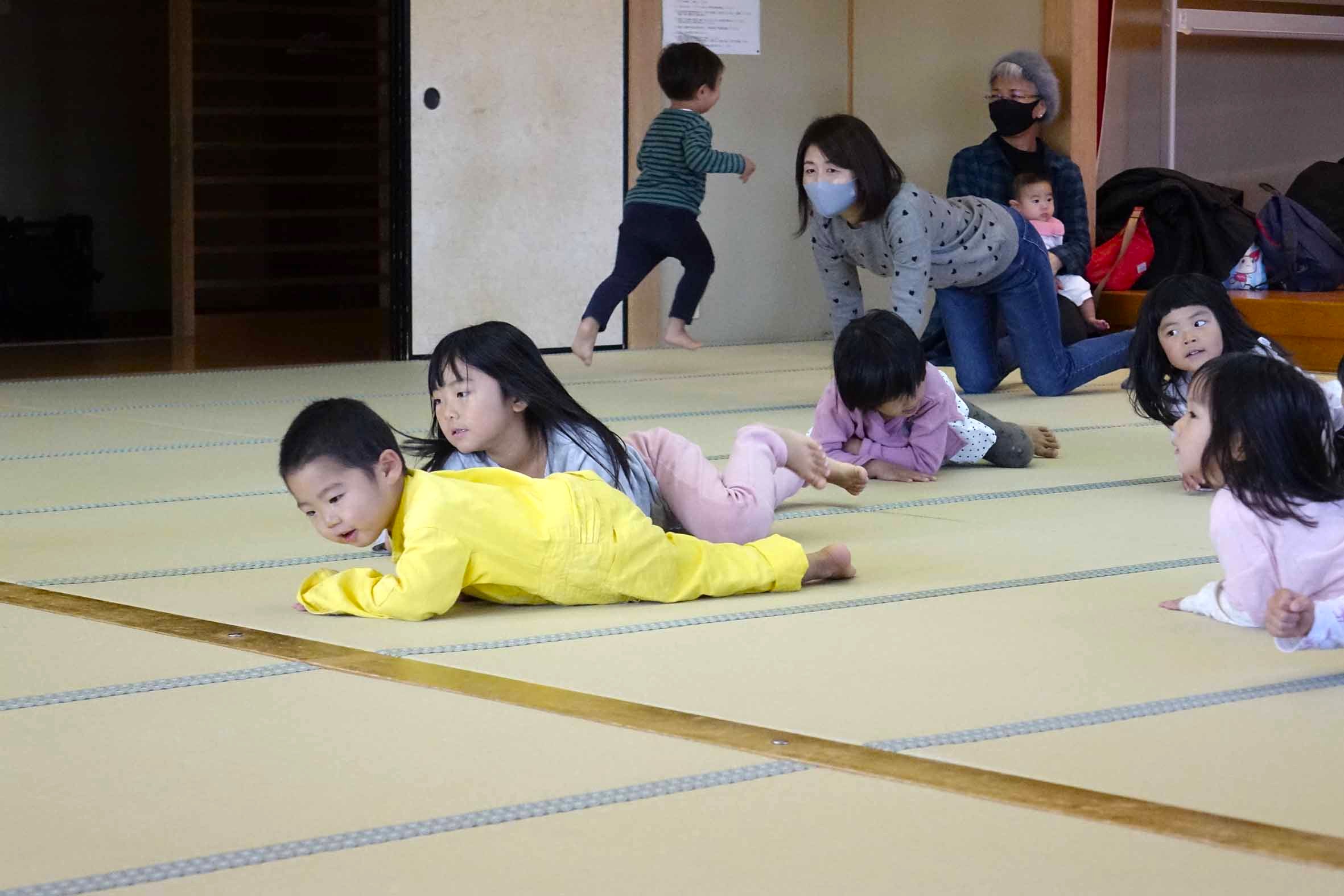 「わにみたいに這う」「うさぎみたいに跳ぶ」、また逆立ちや前転、馬跳びなどで楽しく運動します。全身の筋肉を使い、体のバランスが整います。