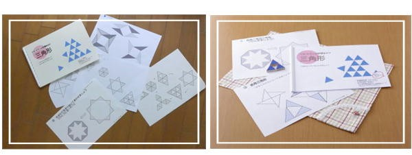 パターンをくり返せば模様になり、六角板(童具館製)上で並べると美しく見事です。